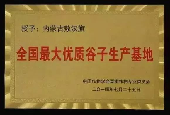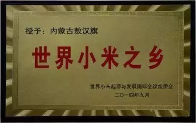 2014年10月31日,在江西省南昌市舉辦的第十三屆中國國際糧油產(chǎn)品及設(shè)備技術(shù)展示交易會上,中國糧食行業(yè)協(xié)會授予敖漢旗“中國小米之鄉(xiāng)”稱號。這是繼世界小米大會確定敖漢旗是“世界小米之鄉(xiāng)”后,獲得的又一榮譽。