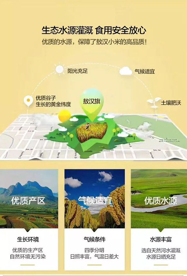 敖漢旗地處北緯42度,日照時間長、有效積溫高、晝夜溫差大,無霜期130-150天,是世界公認(rèn)的最適宜優(yōu)質(zhì)粟黍生長的黃金緯度。黃金苗小米由于生長期長,口感更好,營養(yǎng)也豐富。