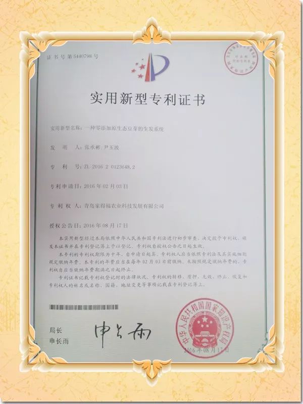 斥資千萬(wàn)打造土缸豆芽生產(chǎn)基地,占地面積2.8萬(wàn)平方米,自主研發(fā)零添加原生態(tài)土缸豆芽智能化生產(chǎn)線、生產(chǎn)設(shè)備翻轉(zhuǎn)架、芽苗菜和食用菌的自動(dòng)生發(fā)系統(tǒng)和下水裝置,獲得10余項(xiàng)國(guó)家知識(shí)產(chǎn)權(quán)局實(shí)用新型專利證書(shū)。