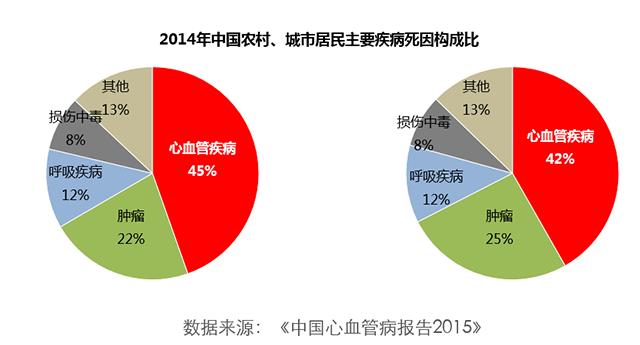 心血管病占居民疾病死亡構(gòu)成在農(nóng)村為44.60%,在城市為42.51。