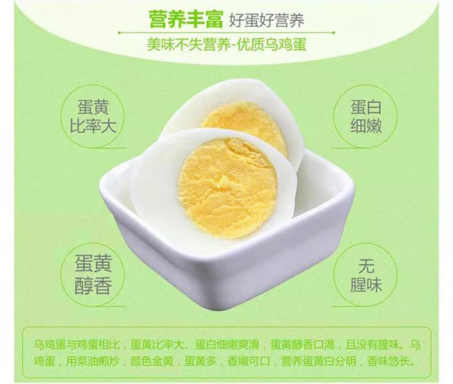 烏雞蛋,富含多種微量元素,有機(jī)鈣含量是普通雞蛋的6倍,膽固醇極低,是普通雞蛋的三分之一。