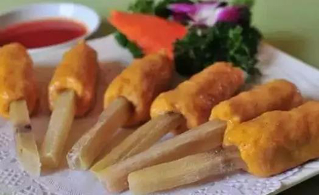 把蝦洗凈去皮,抽去泥腸,稍晾后剁成蝦泥。加入食鹽、料酒、胡椒粉、雞蛋、淀粉拌勻。甘蔗去皮,切成長(zhǎng)棍狀(小拇指細(xì),不能太粗)。把蝦肉泥包裹在甘蔗棍外面,制成甘蔗蝦肉棒,置入油鍋中炸至表面金黃色即可。