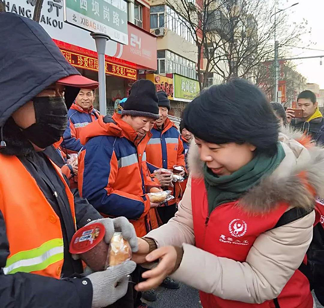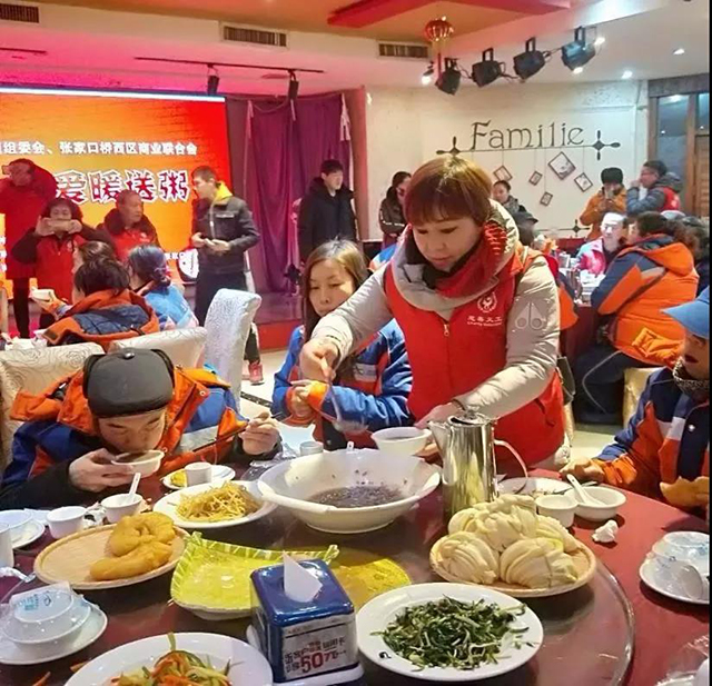 臘八節(jié)當(dāng)天早上6點(diǎn)在張家口橋西區(qū)串窯街小城故事內(nèi)舉行了活動(dòng)啟動(dòng)儀式,志愿者們迎接環(huán)衛(wèi)工安排座位,為到場的環(huán)衛(wèi)工人送上早點(diǎn)以及暖心的臘八粥。