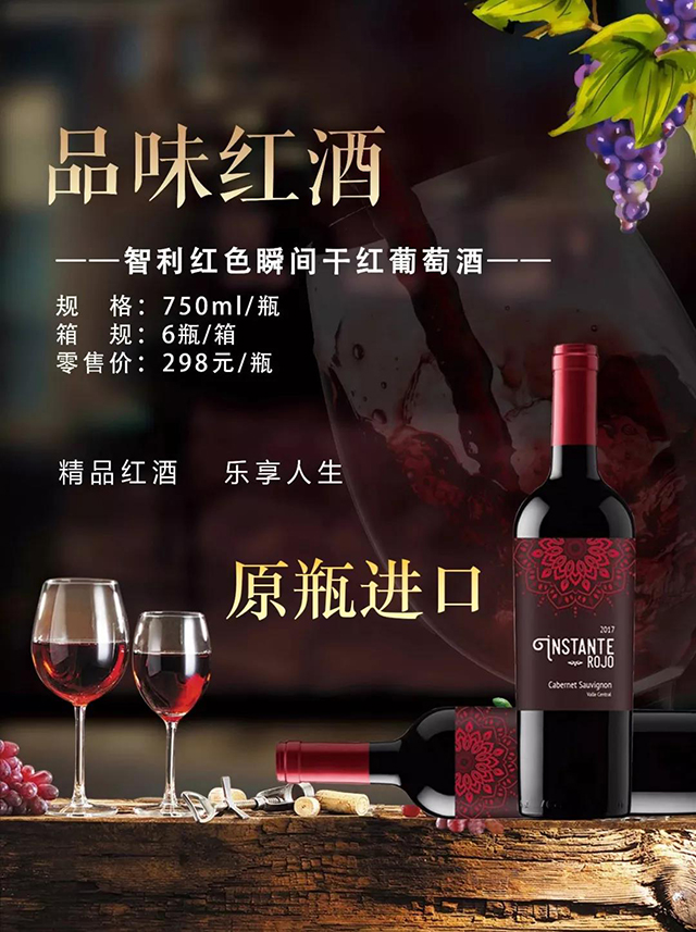 智利紅色瞬間干紅葡萄酒呈現(xiàn)深紫的顏色,并帶有鮮亮的寶石紅色調(diào),擁有草莓、覆盆子等水果的香氣,同時(shí)帶有淡淡的青椒和黑胡椒的氣息。酒體適中,單寧細(xì)致柔和,入口柔順并帶有甜美的果味,回味表現(xiàn)良好,適合搭配牛肉或者燒烤等飲用。
