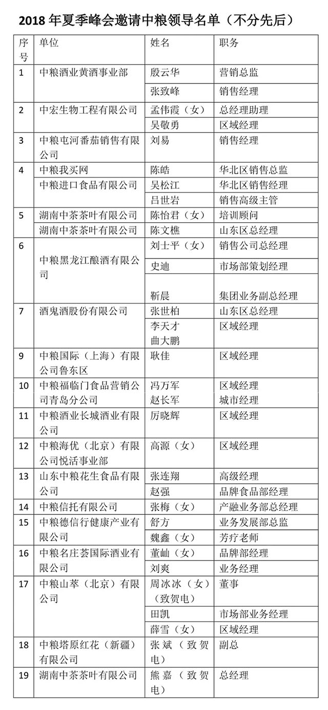 2018年8月2日至4日,中宜國糧2018年半年度峰會于煙臺5A級旅游風景區(qū)南山圓滿舉辦,本次會議邀請了中糧集團各版塊領導參與晚宴及第二天的培訓,嘉賓列名如下: