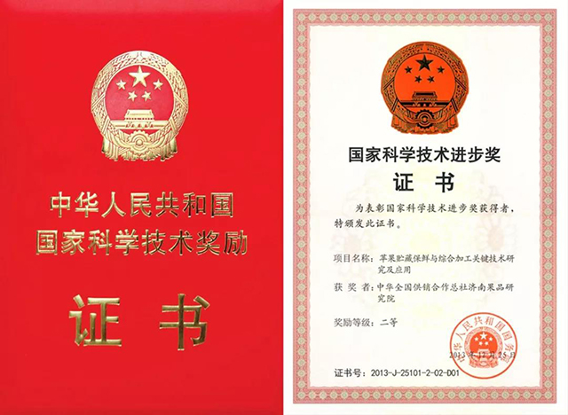 2014年1月10日,由中華全國(guó)供銷合作總社濟(jì)南果品研究院等單位聯(lián)合申報(bào)的“蘋果貯藏保鮮與綜合加工關(guān)鍵技術(shù)研究及應(yīng)用”成果獲得2013年度國(guó)家科技進(jìn)步獎(jiǎng)二等獎(jiǎng)。